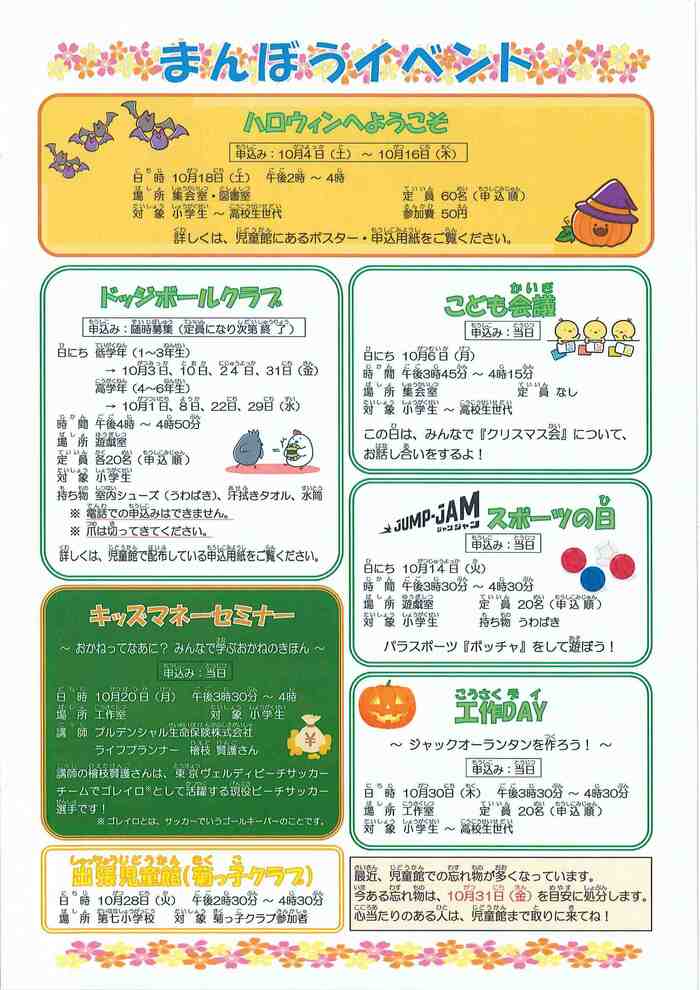 発熱や咳など風邪や感染症の症状があるとき、インフルエンザ等で学級・学年・学校閉鎖になったときは遊べません。 - 貴重品は持ってこないようにしましょう。