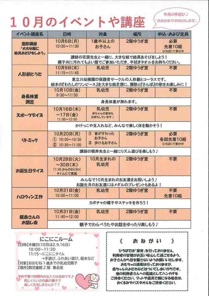利用方法や行事内容など詳しくは、立川市の子育てひろば及び指定管理者のホームページ(下記関連リンクよりご覧いただけます)、館内掲示、おたよりでお知らせしています。