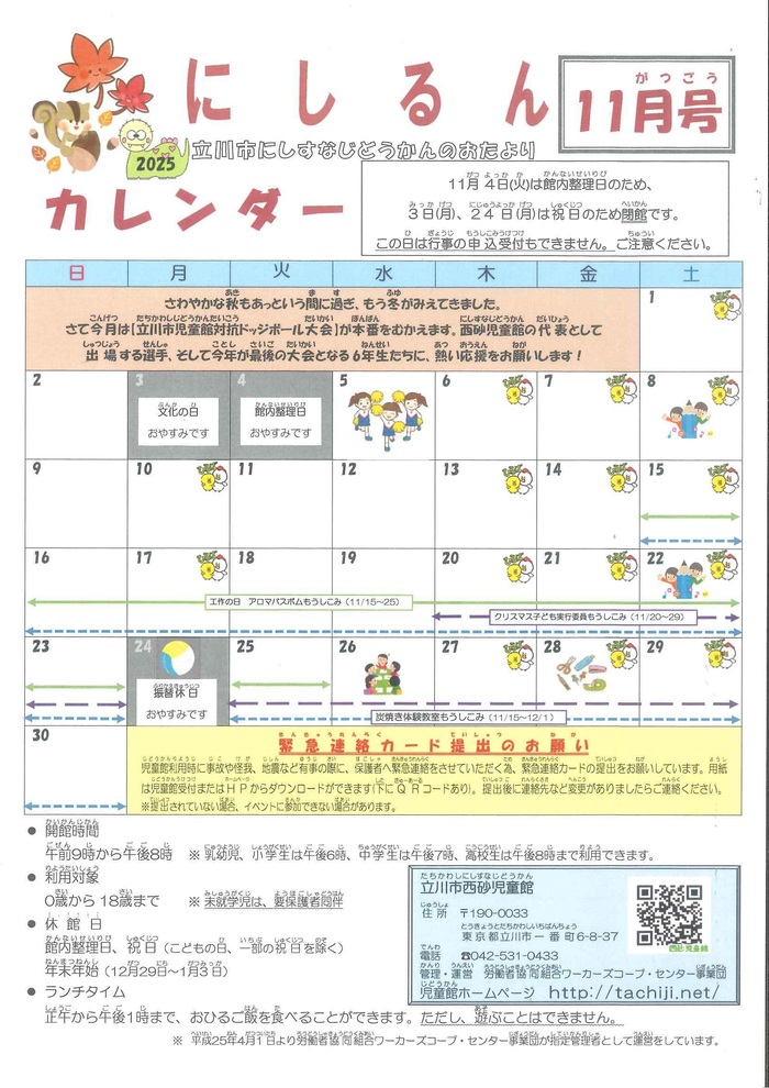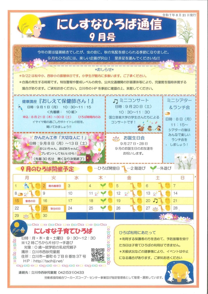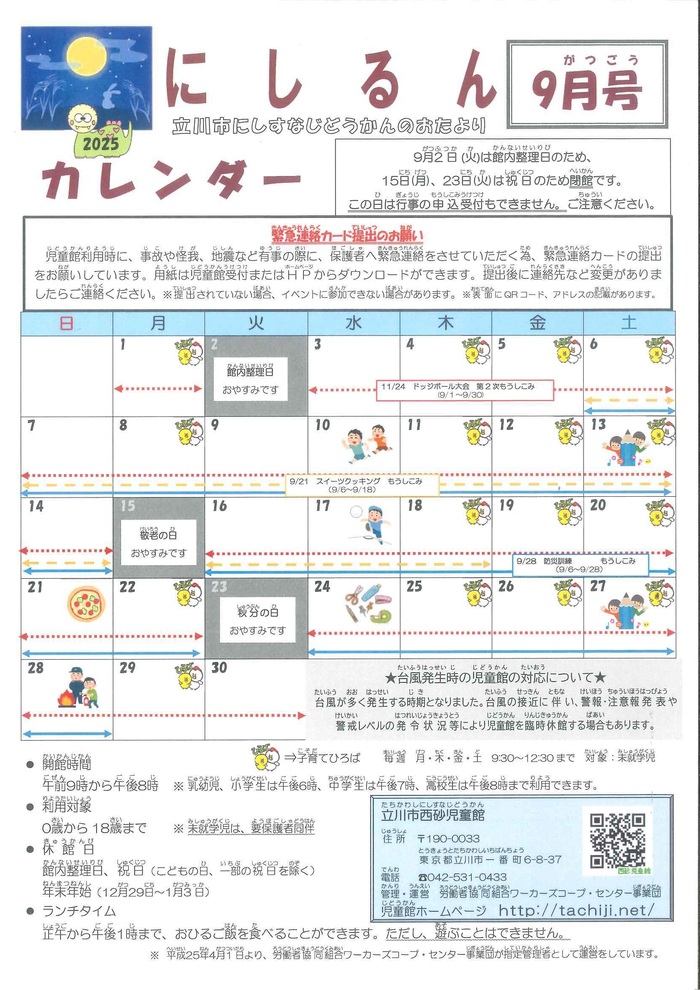 おたよりに掲載されている行事などの詳細については、西砂児童館「きら たち」(指定管理者「(労組)ワーカーズコープ・センター事業団」サイト)をご覧ください。