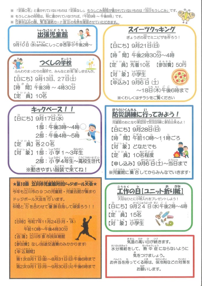 - おたよりに「定員○名」と書かれていないものは「定員なし」、申込期間が書かれていないものは「当日申し込み」です。